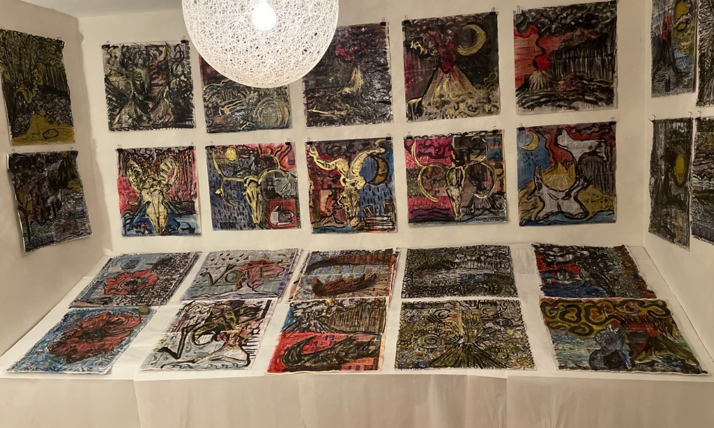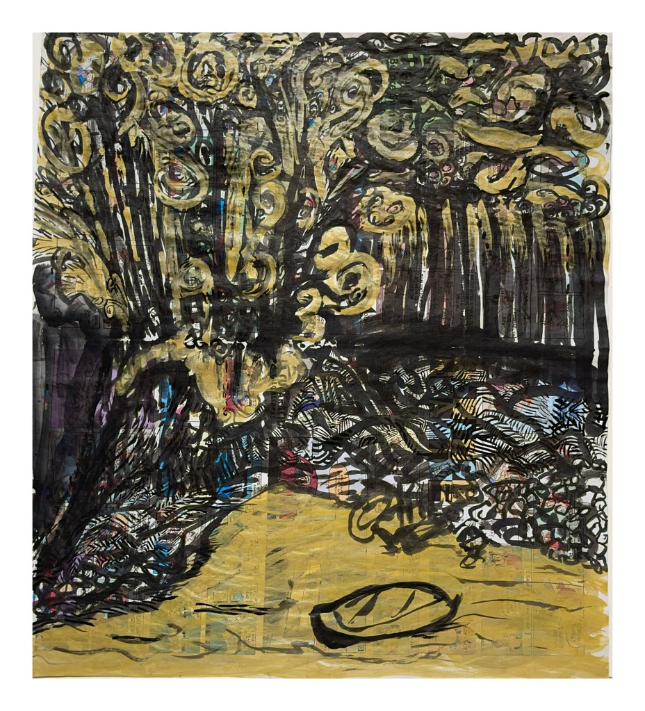 Dealing with the isolation, anxiety, and frustration of 2020’s pandemic, I returned to a method of working to shake up the constraints of other art forms. Using resources available, current newspaper and inks collected over 20 years, fast gestural brushwork and automatic iconography, producing three sets of five, beginning in this series. It’s fast, refreshing and clears the cobwebs out.